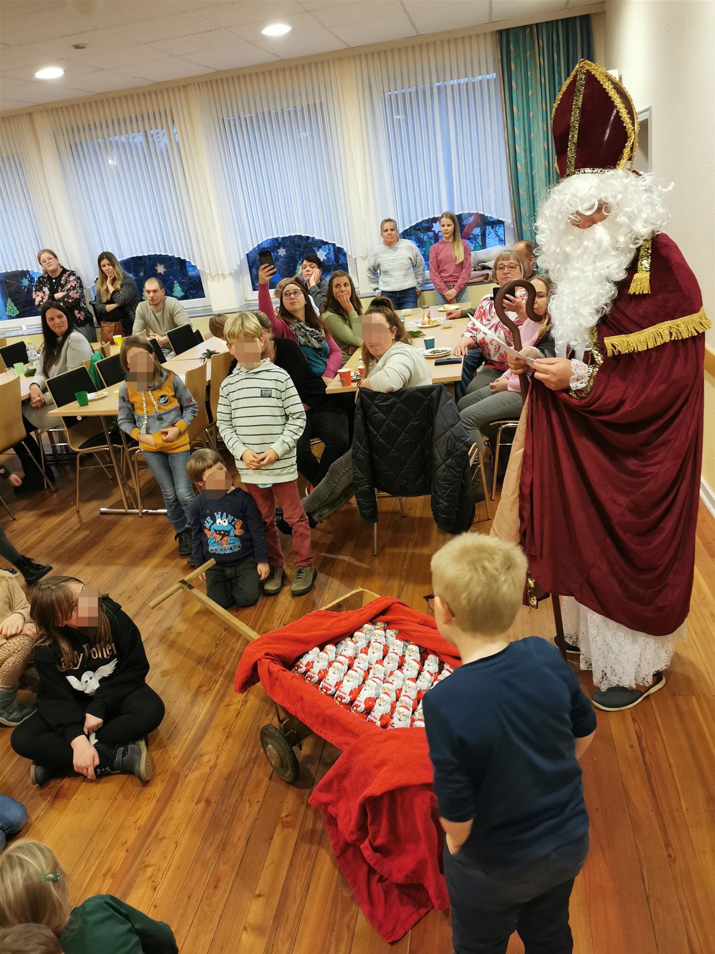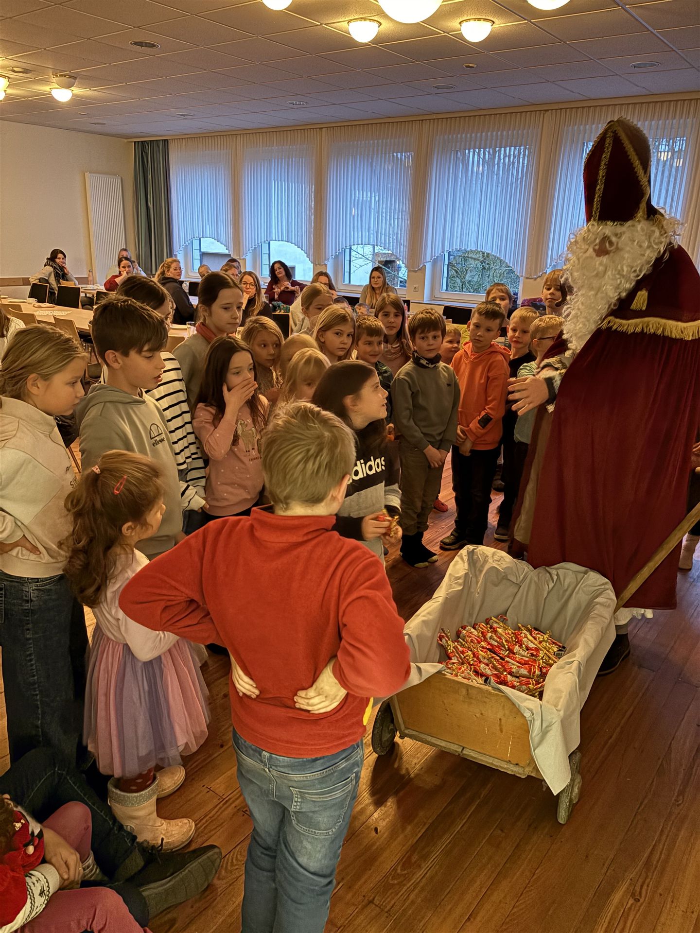 Ganz still wurde es dann, als der Nikolaus mit seinen Geschenken den Saal betrat. Die Gemeinde hat sich sehr über die große Beteiligung gefreut und bedankt sich bei allen Mitwirkenden für diese tolle Weihnachtsaktion.